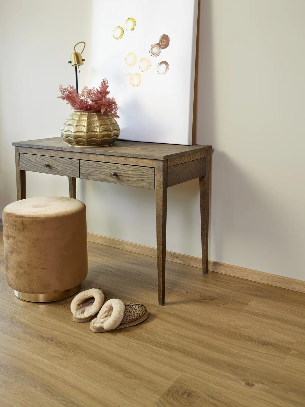 Gulvet har integrert underlag som demper lydstøy og korrigerer for mindre ujevnheter. Det er vann-/ fuktbestandig så derfor et ideelt valg også for kjøkken og gang.