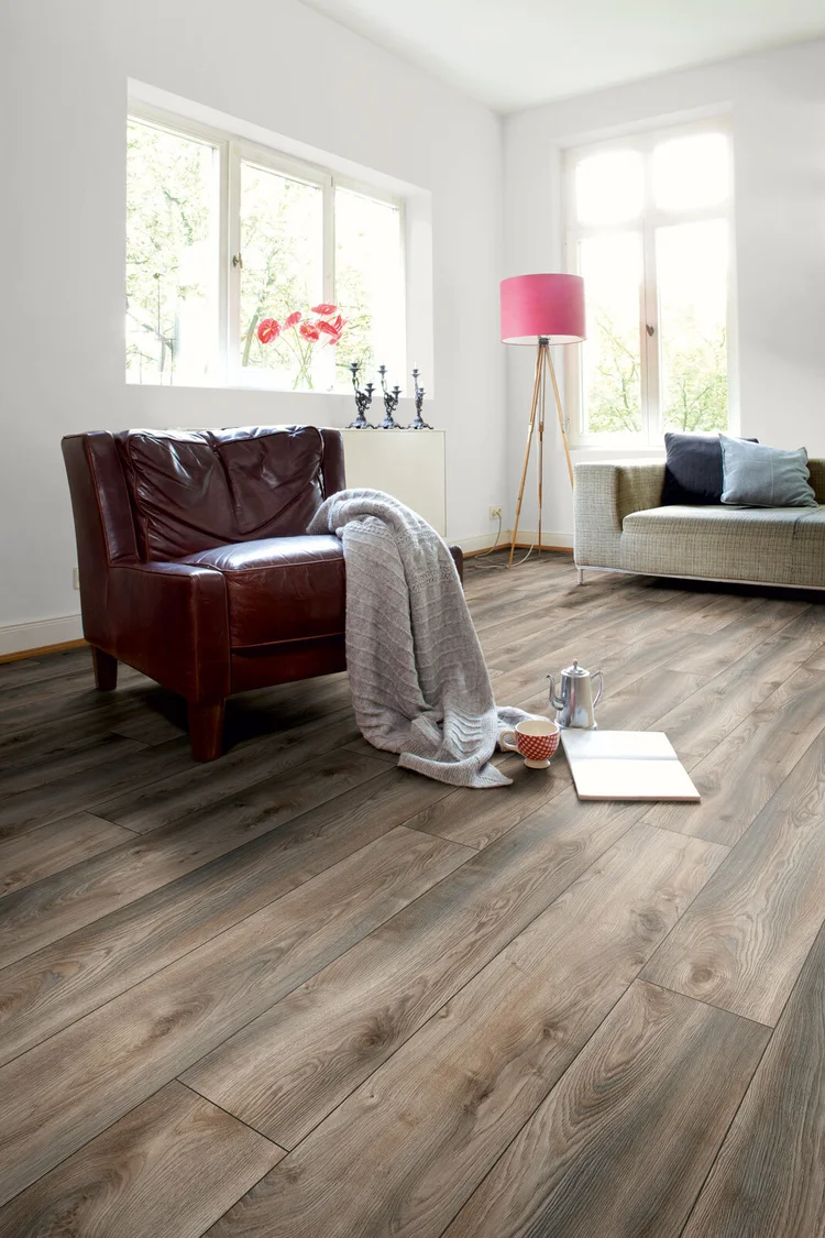 Kronotex laminat Mammut 4792 Macro Oak Grey er et flott og slitesterkt 12mm laminatgulv med trestruktur dekor i eikefarger. Denne dekoren er svært naturtro, og den lune fargen gir rommet en varm og koselig stemning. Med dette gulvet får du utseende til en parkett med fordelene til et laminat. Gulvet er perfekt for hverdagslivet da det tåler både hund, viltre barn og vannsøl. G5 Express clicksystemet gjør gulvet enkelt å legge og er designet for å motstå stor belastning. Mammut kan legges i kommersielle rom med høy slitasje, og er det ypperste innen laminatgulv. Produsert med kjerne som gir særdeles høy beskyttelse mot fukt.