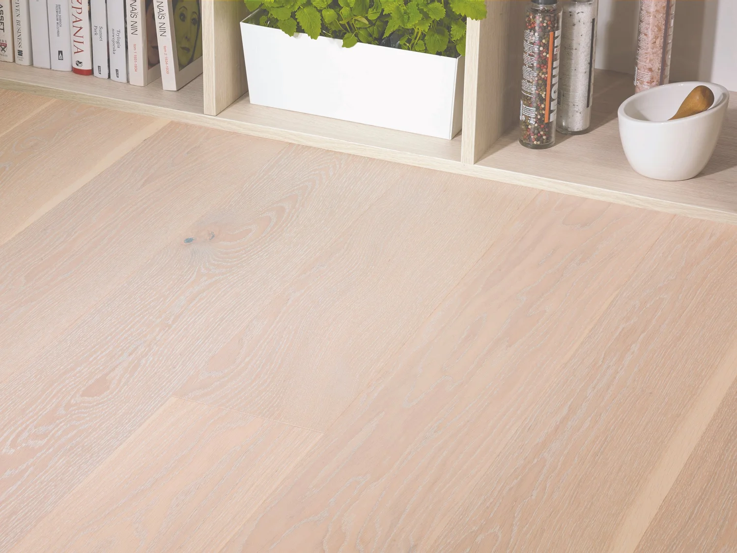 SAGA Exclusive Cream er en lys og moderne 1-stavs eikeparkett. Overflaten er behandlet med mattlakk.