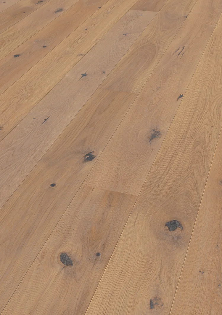 SAGA Exclusive Eik Dolomite er en varm 1-stavs parkett fra SAGA med sandtoner. Denne eikeparketten har et rustikt utseende med kvist i varierende størrelser. Overflaten er lakkert med matt lakk og er børstet for å fremheve treverkets naturlige skjønnhet og struktur. Bordene er faset på langsidene.
