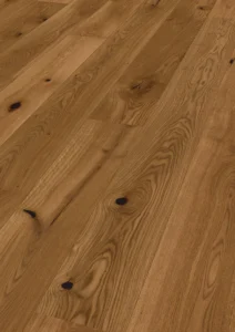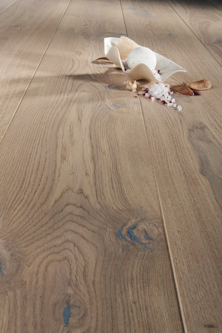 Dette gulvet er børstet for så tilført mattlakk. Parkettgulvet har kvister, hvor løse kvister sparkles igjen før behandling for å sikre at de ikke løsner. Kvistende gjør at gulvet gir liv og blir levende.